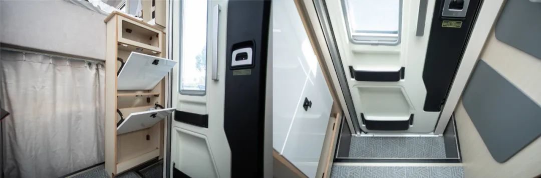 驾驶舱与后方生活区采用贯通式设计,但日常进出还是从房车专用乘客门更加方便一些;乘客门内部下方配置了双层翻折式鞋柜、置物格方便上下车使用。