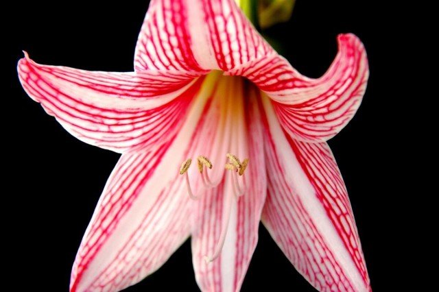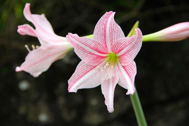 每年4~6月和9~10月为白肋朱顶红自然花期,也可人为控制花期。球茎直径5厘米以上即可开花,花箭从叶腋间抽出,高32厘米左右,球茎越大,花箭越多,每个花箭顶端开花2~6朵,以4朵为最常见,花喇叭型,花径12厘米左右,花白底密布红色细脉纹,花茎中空,亭亭玉立,朝阳开放,显得格外艳丽悦目。