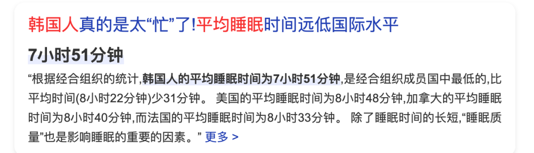 当然这只是韩国全年龄层的睡眠数据统计,要细化到韩国年轻人的睡眠水平,5个小时都嫌多了。