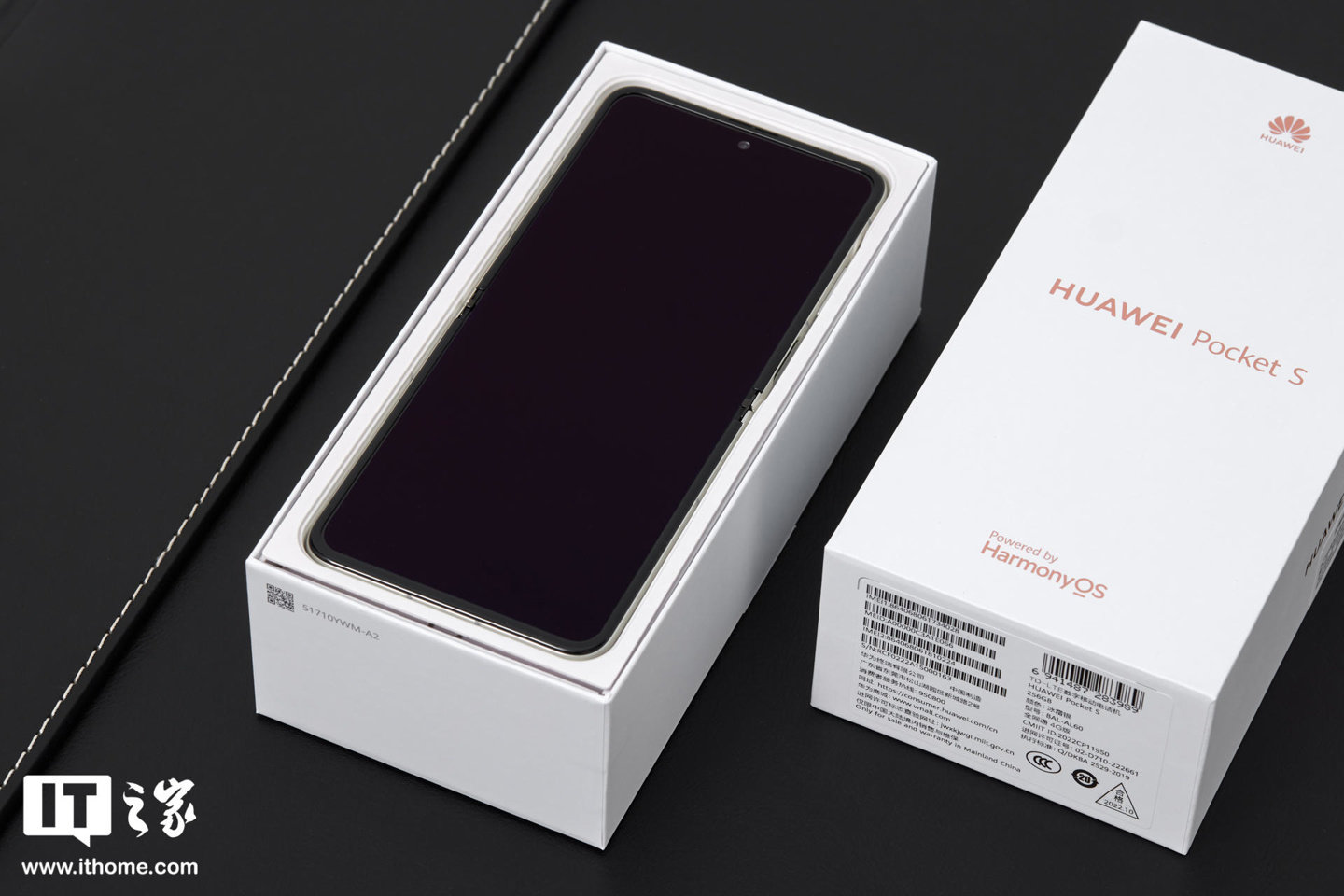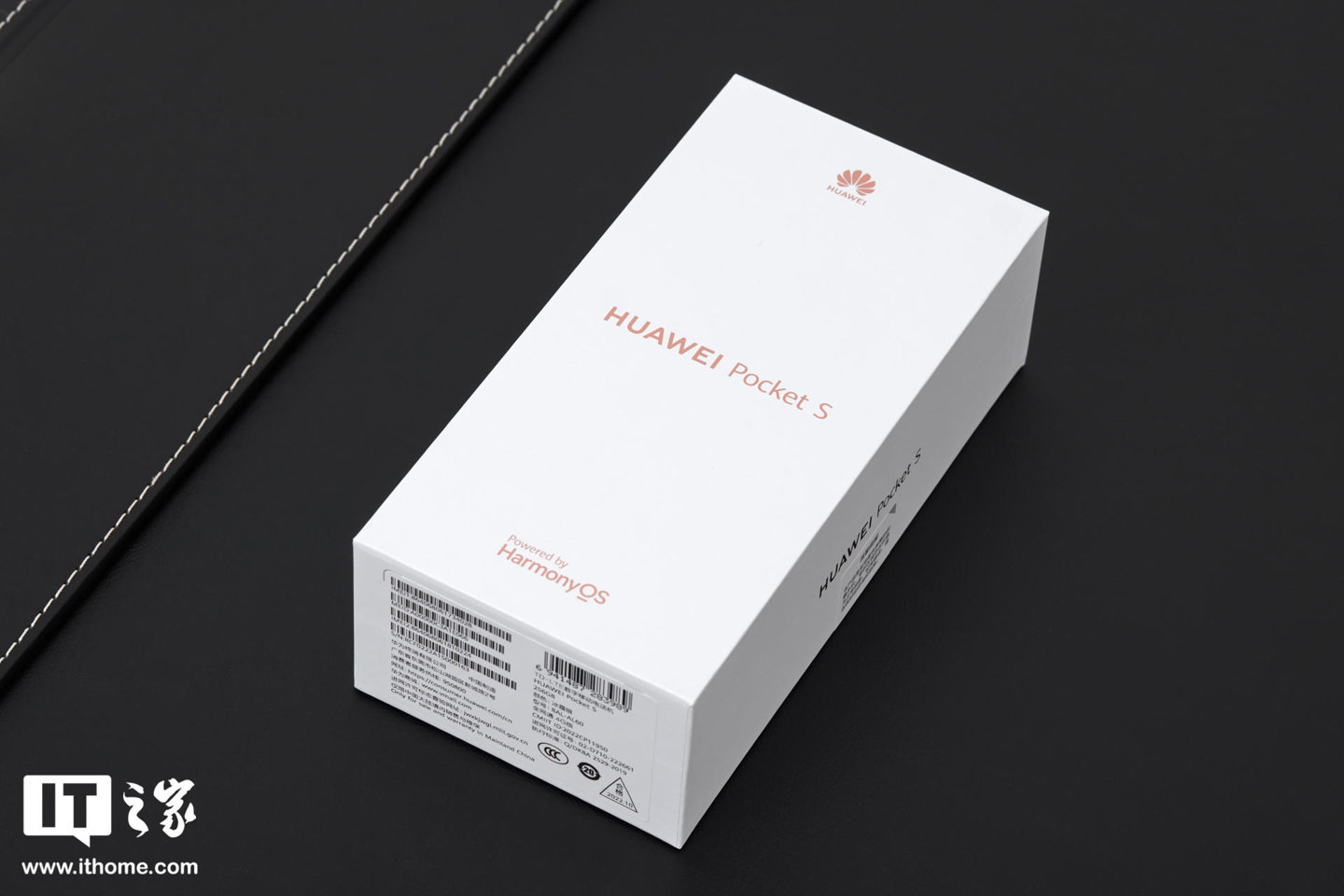 包装设计上,华为 Pocket S 采用了家族式设计,白底金字,上面印有产品型号以及华为、鸿蒙的标识。