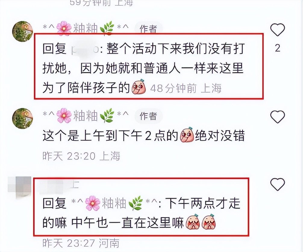 对于杨颖在现场的表现,这位偶遇网友的评价给得很高,认为杨颖并不是作秀,称她从上午到下午2点一直在活动现场,整个活动中,其他家长也没有打扰杨颖,杨颖也是跟普通妈妈一样在这里专心陪伴孩子,就是专门过来享受亲子生活。