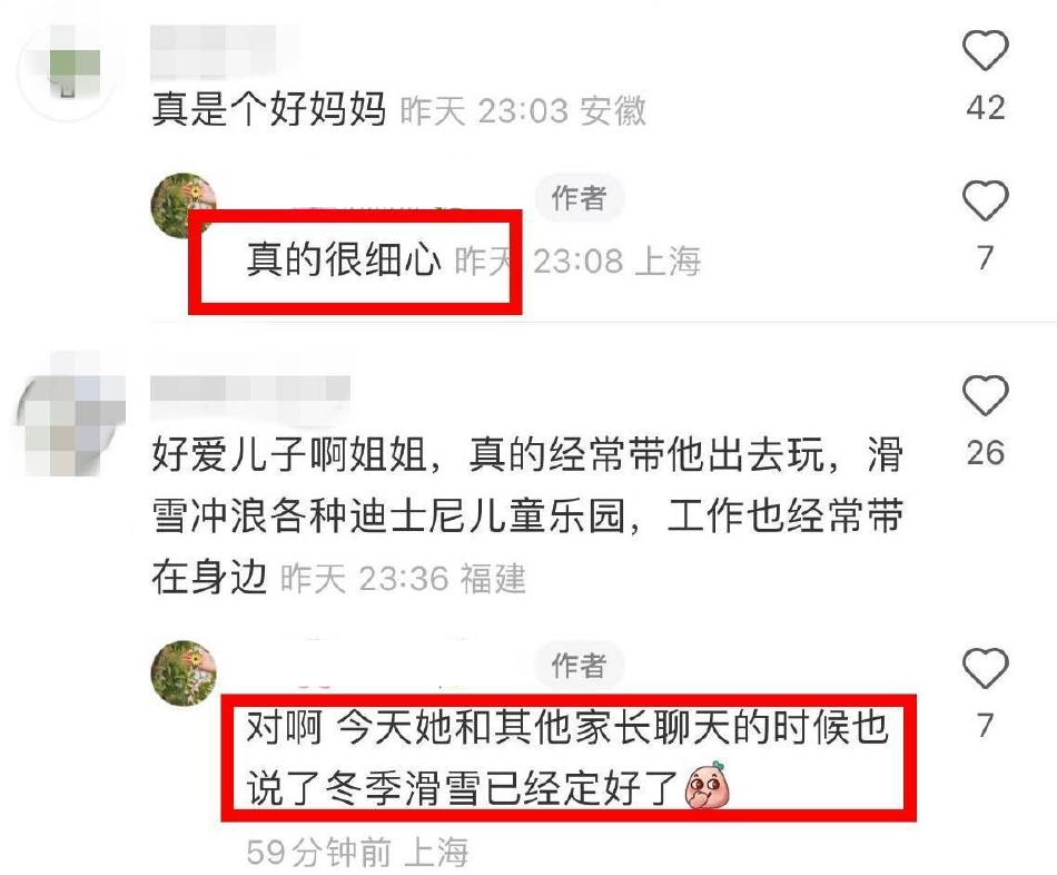 在评论区,其他网友夸杨颖真是一个好妈妈,偶遇的网友也说她真的很细心,还提到家长们聊天的时候,杨颖说已经安排好冬季滑雪项目了,这个准备打一百分。