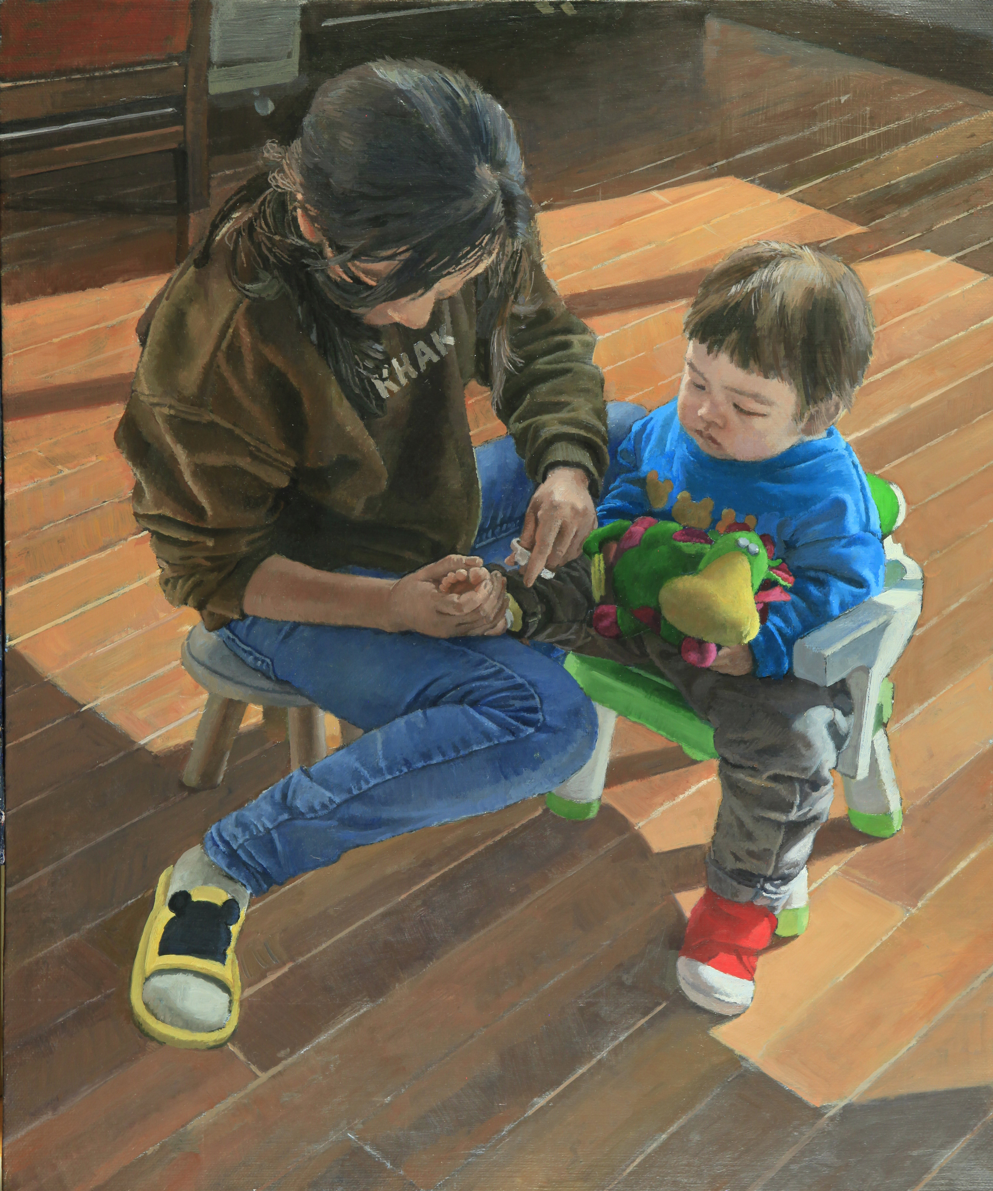 身边的亲友纷纷成为艺术家们笔下的主角。艺术家梁进青将大学生作为肖像创作的对象,以不同的风格语言表现着青春朝气;孙化一用现实的手法通过作品《剪指甲》、《晚餐》传递着家的温暖。