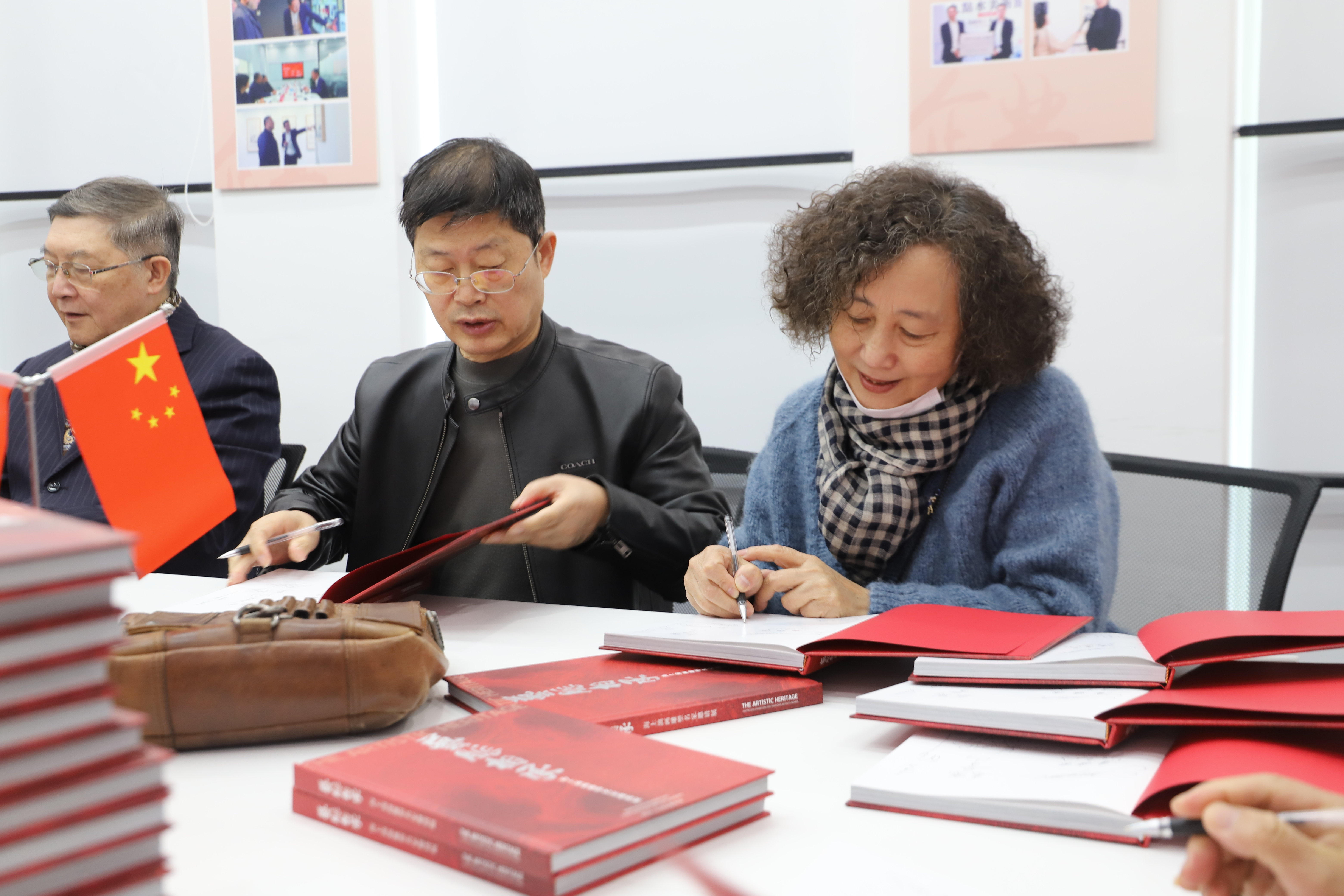▲ 艺术家为展览画册签名(从右至左依次为:刘思、姜建忠、贺寿昌)
