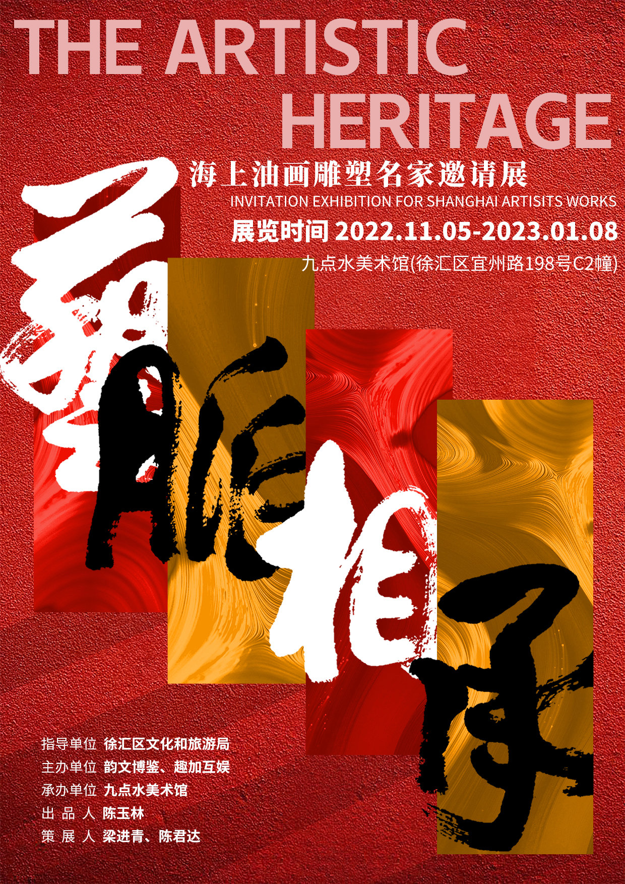 本次展览由“韵文博鉴”和“趣加互娱”主办,九点水美术馆承办,由著名艺术家梁进青和九点水美术馆馆长陈君达担纲策展人,并得到了徐汇区虹梅街道的大力支持。