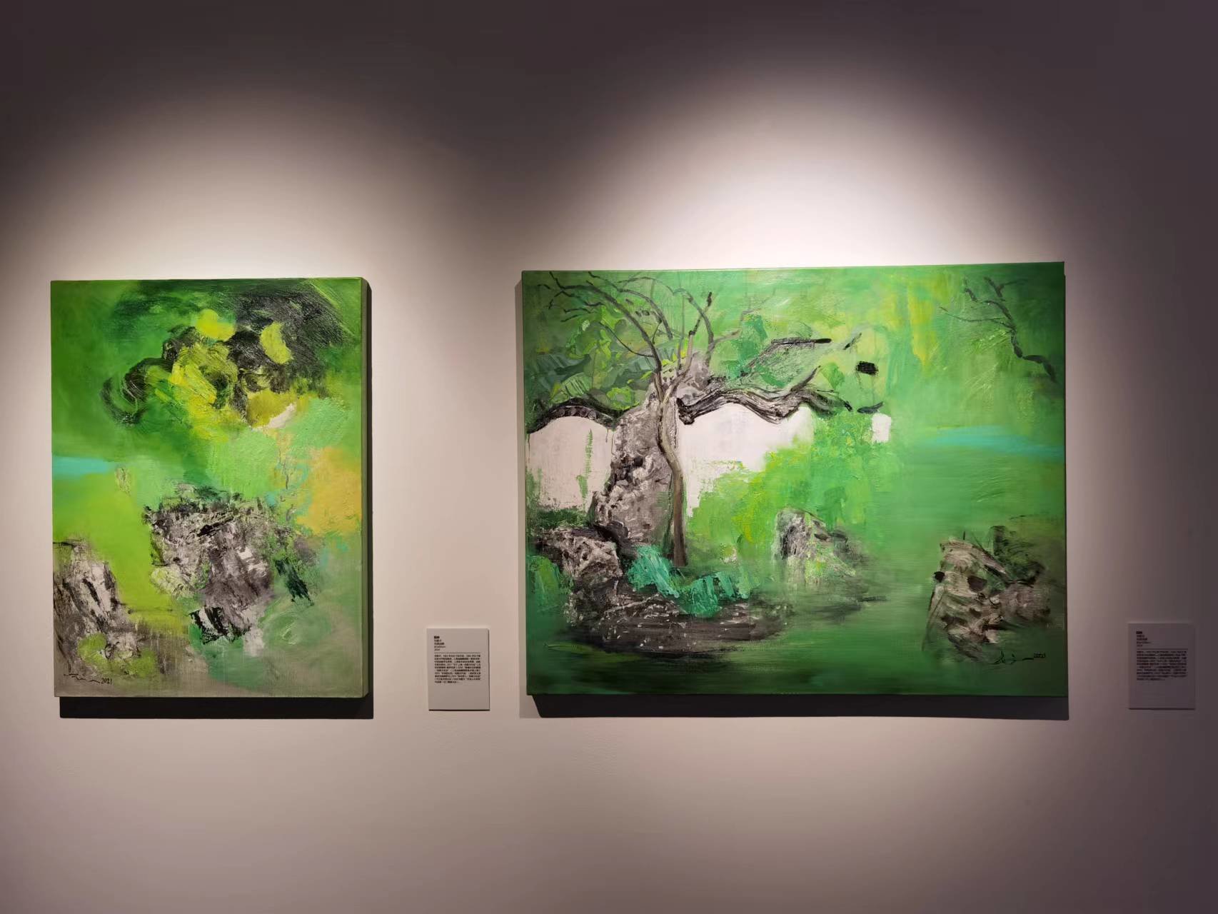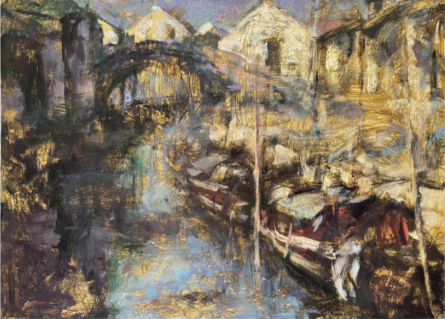 除了耄耋之年的“他俩”,还有“她仨”值得关注。这三位女性艺术家分别是刘思、刘曼文和冯正安。刘思的作品《落叶》,用笔写实果断、画面细节生动;刘曼文的《园林》以宋画中绢的颜色作为底色,风格颇为写意;而冯正安的两幅作品都与上海有关。作为土生土长的青浦人,她笔下的青浦朱家角银装素裹,从用色到构图都显得清新脱俗。她们三位的艺术之路可谓是“殊途同归”,其中,刘思是留学归来;刘曼文是从鲁美出来;冯正安最为特别,退休之前是上市公司的高管。虽然她们的经历不同,但都有一颗热爱画画、热爱生活,勇于表达的心。
