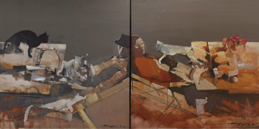 艺术家张自申、章永浩是参展艺术家中最为年长的两位。90高龄的张自申师从吴作人、艾中信,他的许多作品被收藏和陈列于中国历史博物馆、中国人民解放军军事博物馆、中央民族博物馆和北京人民大会堂等。此次参展的《春雨》、《秋色》是他特意为“艺脉相承”新近创作的油画作品。同样90高龄的章永浩,是一位雕塑大师。就是他,创作了矗立于外滩的《陈毅市长像》。这次参展的作品《太极》和《对歌》,创作于上世纪七、八十年代,但从线条、构图来看,放在今天依然充满魅力。《对歌》还被放大安置于滴水湖畔,勾画出一幅悠然自得的美好画面。