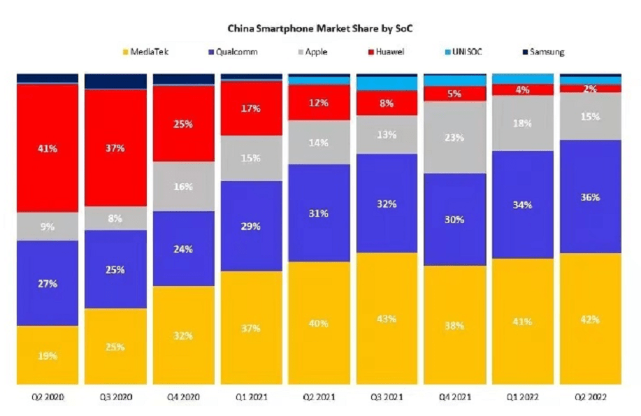 根据全球知名市场调研机构Counterpoint Research发布的报告显示,联发科在全球和中国智能手机芯片市场份额中连续八个季度保持第一的领先地位,今年第二季度更是斩获中国手机芯片市场42%的份额,足可见市场对联发科天玑芯片的认可度之高。