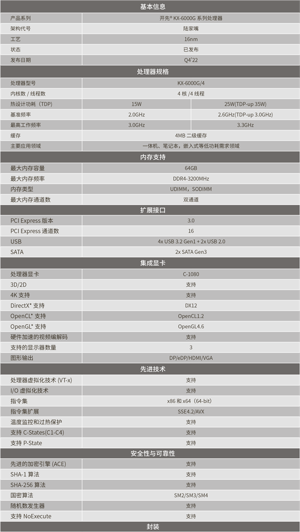 开先KX-6000G系列延续了2019年发布的开先KX-6000系列的16nm制造工艺,但是CPU计算架构、GPU图形性能、能效都有大幅的提升,并具备高效、兼容、安全等特点。