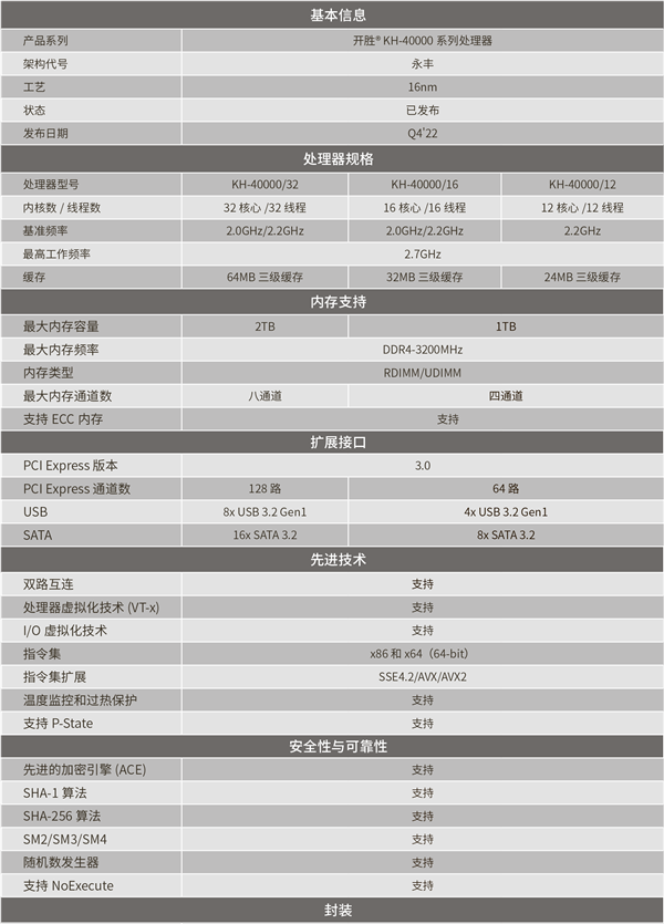 开胜KH-40000系列处理器兼容x86指令集,支持SM2、SM3、SM4加速指令,还支持处理器和I/O虚拟化技术、安全启动技术和国标可信计算体系、服务器级别的RAS,同时还进一步增强了BMC管理功能。