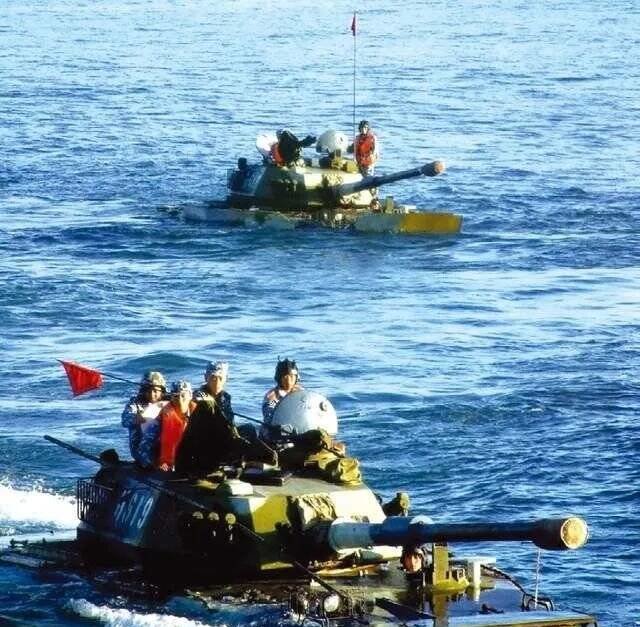 63式水陆坦克从岸滩下海进行海上浮渡训练