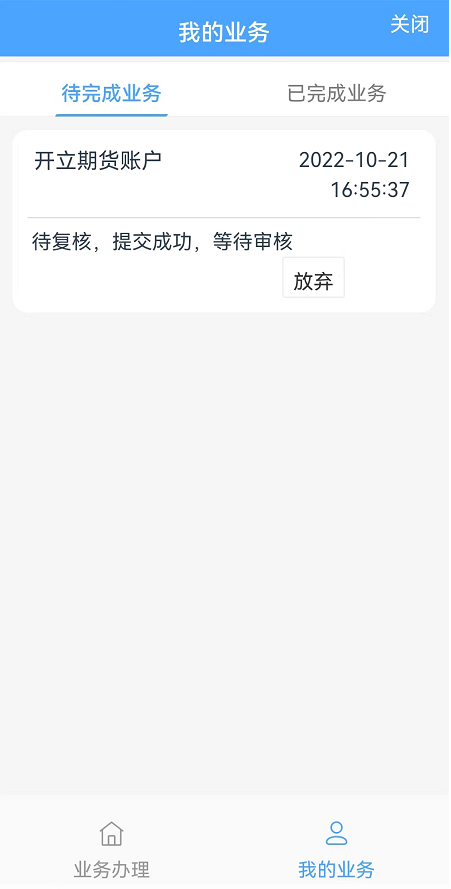 13、等待开户反馈:回访问卷提交后会出现待复核界面,请等待期货公司工作人员审核,开户成功后工作人员会即时短信告知您期货交易账号的相关信息,如果开户失败会有工作人员与您联系。