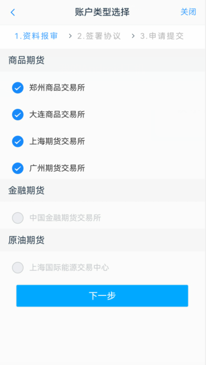 7、资料报审选择需要开通的交易所,灰色的是不能选的,选择后然后下一步。