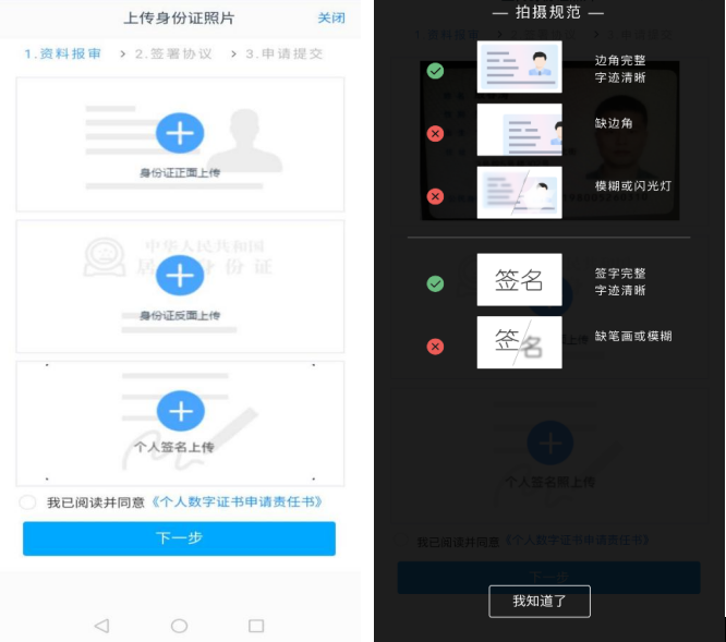 3、上传身份证正反面照片,图片要近距离拍摄、四个角露出,图片完整清晰。上传提前准备好的白纸签名照片,勾选“我已阅读并同意”然后点击下一步。