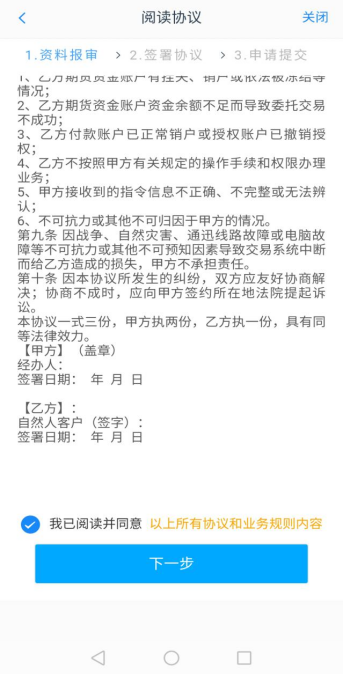 8、阅读协议拖动滚动条仔细阅读所有协议和业务规则内容,在阅读并完全理解后勾选“我已阅读并同意以上所有协议和业务规则内容”,协议内容要拖动到下拉框的底部,才能点击“下一步”。