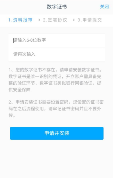 12、安装数字证书,输入6-8位纯数字,2次输入一直即可,后期开户云上办理业务需要用到。查看《数字证书申请责任书》,确认后点击申请并安装。