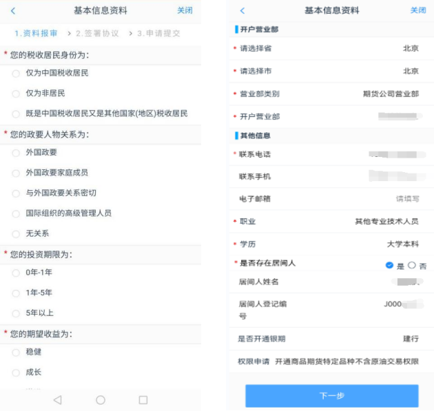 4、填写基本资料:带“*”号为必填项,联系地址需要精确到门牌号,开户营业部+居间人姓名+居间人登记编号一定要写对,写错无法享受到期货居间人或客户经理提前跟您约定好的手续费标准和返还比例。