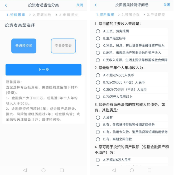 6、选择普通投资者,专业投资者需要提交各种材料比较复杂。完成投资者风险测评问卷,按照真实的填写就行,要与之前在基本资料所填信息保持一致。