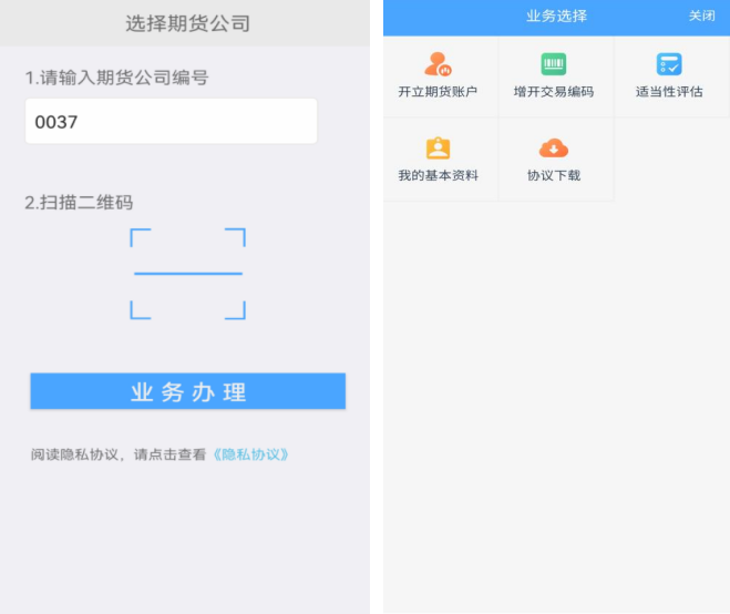 1、输入期货公司编号,点击业务办理,然后选择“开立期货账户”。