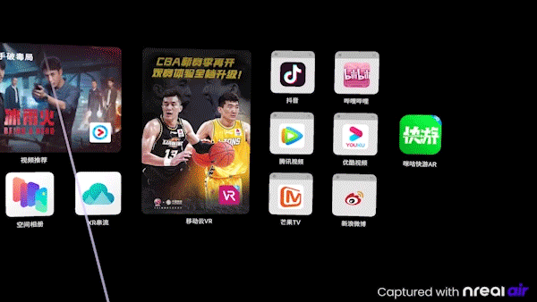 进入AR空间之后,映入眼帘的是一个环形的桌面,各种功能图标整齐摆放在你眼前,可以浏览照片视频,看抖音、优酷、芒果TV等流媒体平台,手机接个外设还能玩玩游戏、办办公,由于使用了手机做计算,流畅度等实际体验是要比目前大多数3000档位AR眼镜要好一些的。