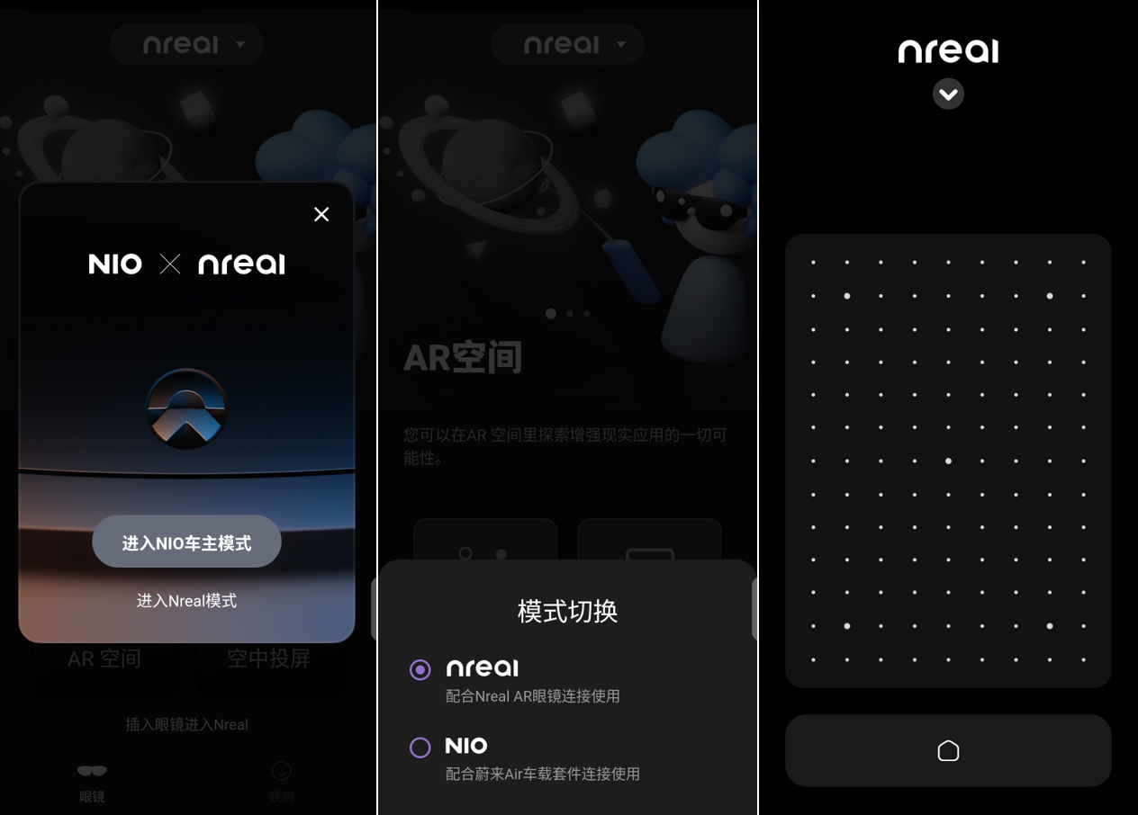 AR空间模式分为NIO车主模式,适配蔚来Air车载套件,Nreal模式即为常规的AR模式,使用手机的作为指针,屏幕作为操控按键进行操作。