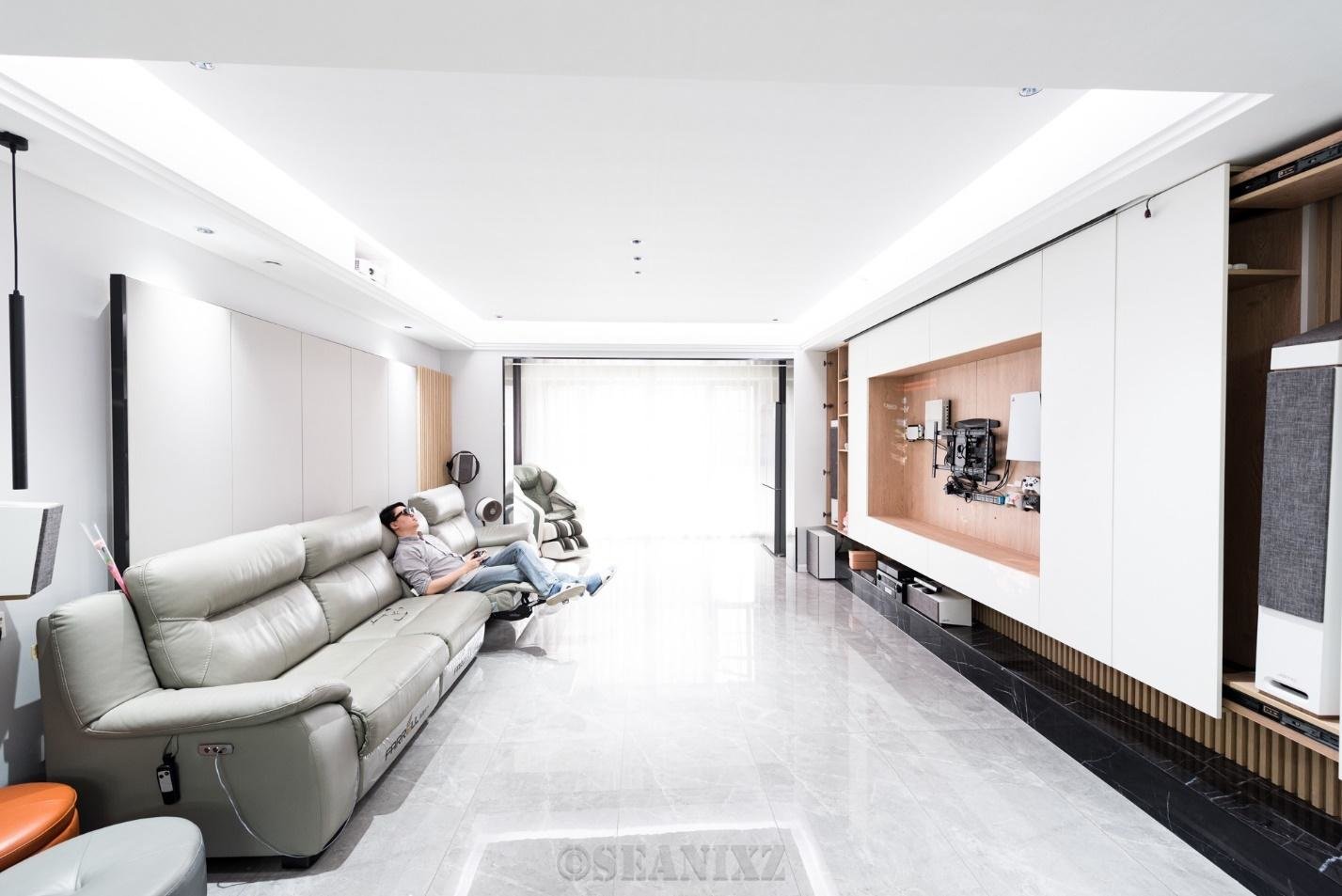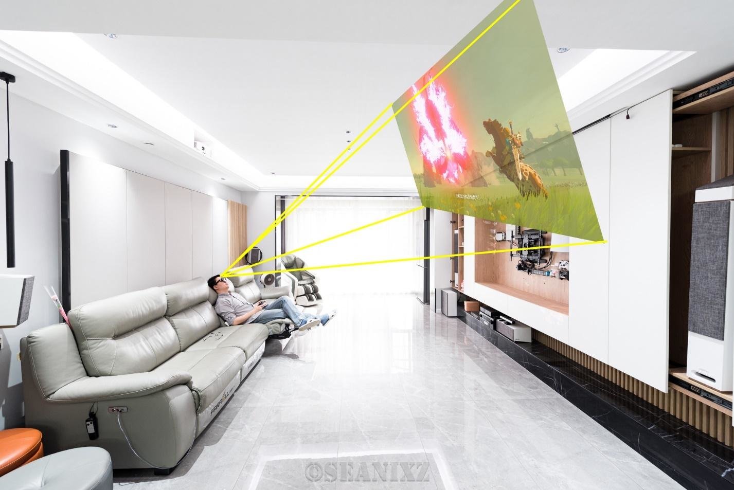 我装修的时候,在沙发位置预埋了到功放的HDMI线,以前是准备抱个笔记本用投影玩游戏的,现在派上了大用场,只要接上HDMI线,眼镜一戴就可以躺着畅玩游戏了,用起来也很方便。