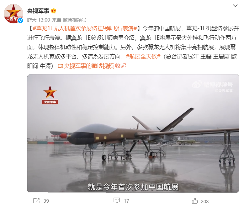 此外,翼龙-1E 机型将首次参展并挂 9 弹进行飞行表演。据翼龙-1E 总设计师唐勇介绍,翼龙-1E 将展示最大外挂和飞行动作两方面,体现整体机动性和稳定控制能力。另外,多款翼龙无人机将集中亮相航展,展现翼龙无人机家族多平台、多谱系发展方向。