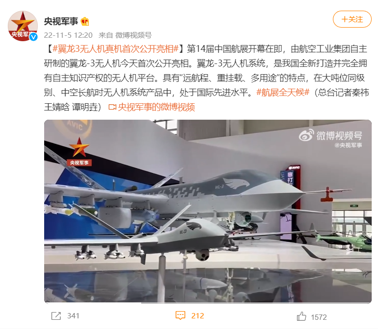 据报道,翼龙-3 具有“远航程、重挂载、多用途”的特点,在大吨位同级别、中空长航时无人机系统产品中,处于国际先进水平。
