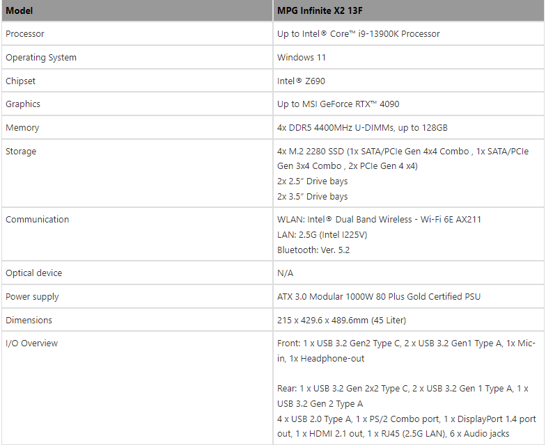 MPG Infinite X2 的完整规格: