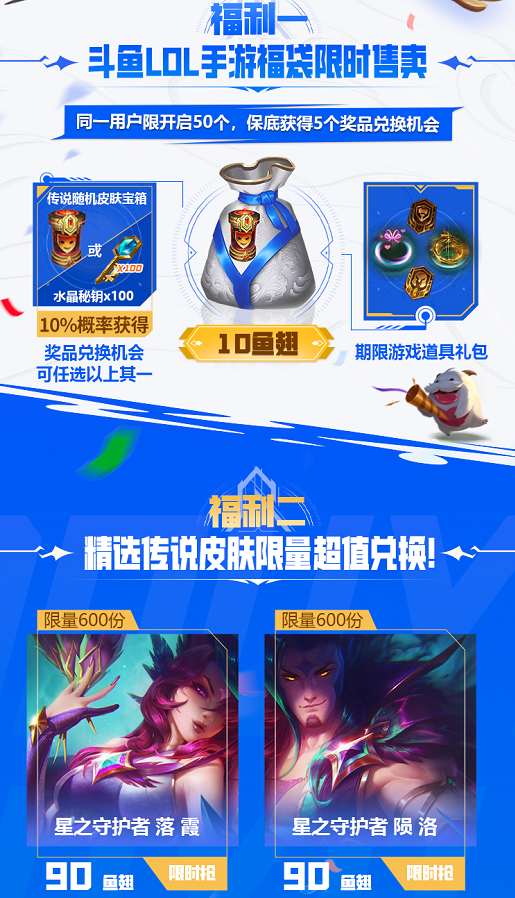 这次的“传说福袋”分为三个福利,福利一为10鱼翅的福袋,可以开出传说皮肤随机宝箱或者水晶秘钥100,两者自选,其他为一些材料和期限道具。值得提醒的是,50个有保底5个传说和100秘钥自选;福利二,可以入手9折后的星之守护霞洛皮肤,分别都是90鱼翅,喜欢下路的小伙伴可以考虑;另外福利三,算得上是保底之中的保底,满100鱼翅反10QB,满十鱼翅送额外宝箱,这个宝箱概率开出100QB、头像框、头像等。