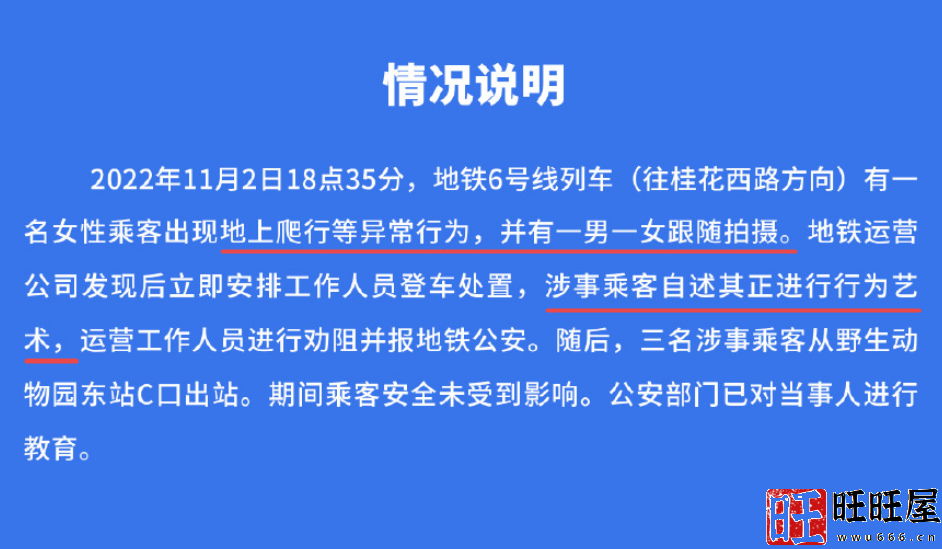 11月4日杭州地铁官方发布了情况说明,表示该事件发生在11月2日的晚上18点35分,女性乘客爬行,并有一男一女跟随拍摄。地铁工作人员发现后立即上车处置,爬行的乘客解释称自己正在进行行为艺术,工作人员劝阻了她的行为并把这一情况报告给了地铁公安。随后,三人下车离开了地铁,最终公安部门对当事人进行了教育。