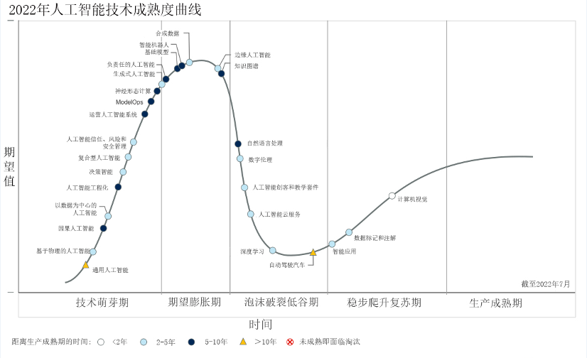 根据Gartner2022 年度人工智能技术成熟度曲线,智能应用(AI applications)已经翻过了第一座大山,进入到稳步爬升期,距离生产成熟期只有2-5年的时间窗口。