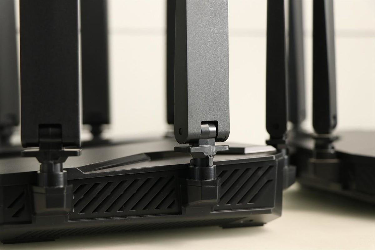 机身顶部印有logo图案和wifi6字样,而且6根天线可以随意旋转调整方向和角度,在往类似电视柜等小空间里放置或收纳时可将天线折叠起来。