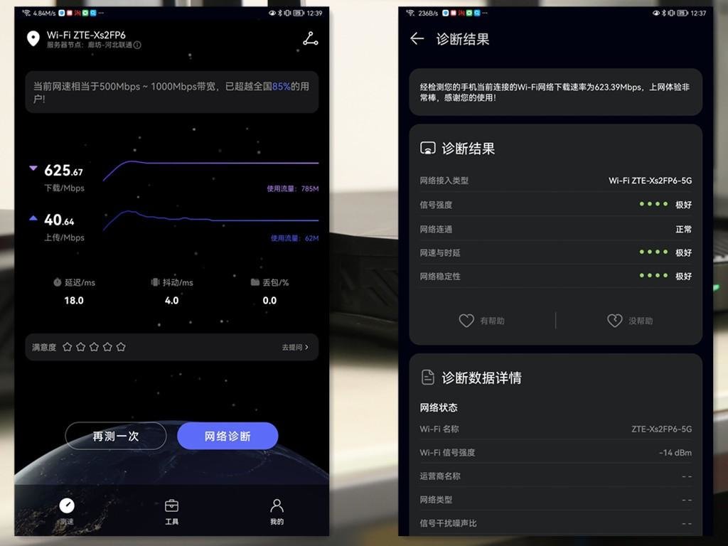 我家里目前使用的是500Mbps宽带,使用中兴AX5400 Pro+后连接实测实时下载速度为625.67Mb/s,上传速度为40.64Mb/s,延迟为18.0ms,抖动4.0ms,可以说完美发挥了入户宽带的性能。