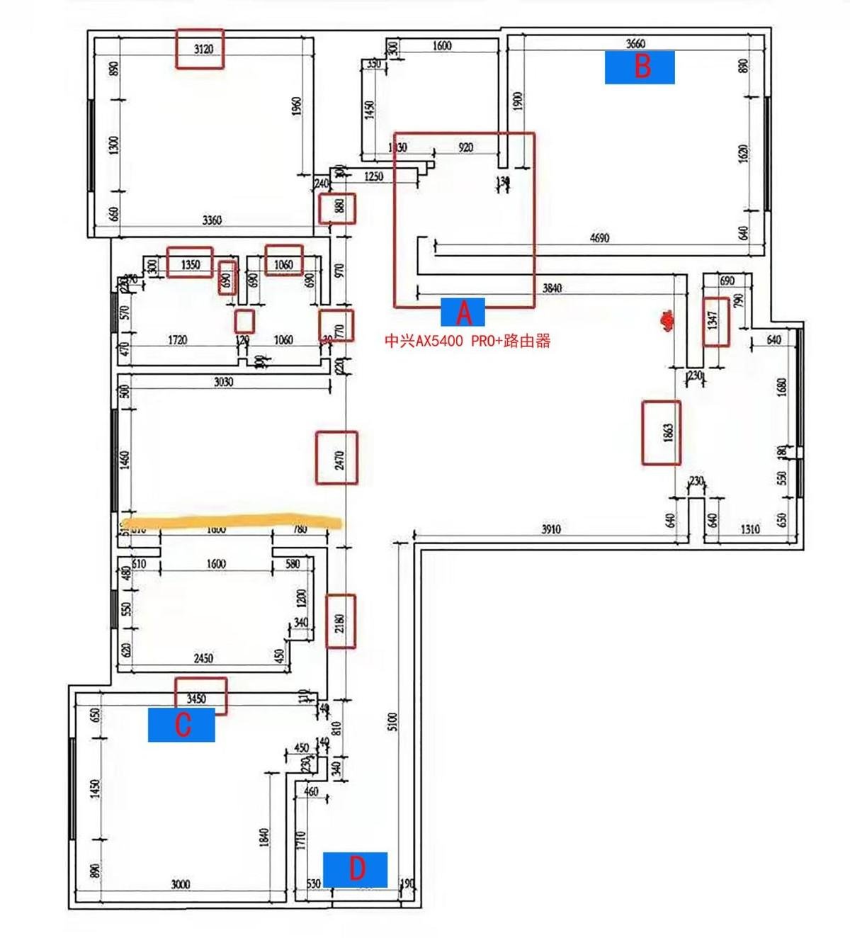 B点位只与AX5400 Pro+距离大概3米,但是隔着一堵墙(非承重墙),实测这个位置的下载速度为630.80Mb/s,延迟为22ms,相比普通路由器有较大的提升。