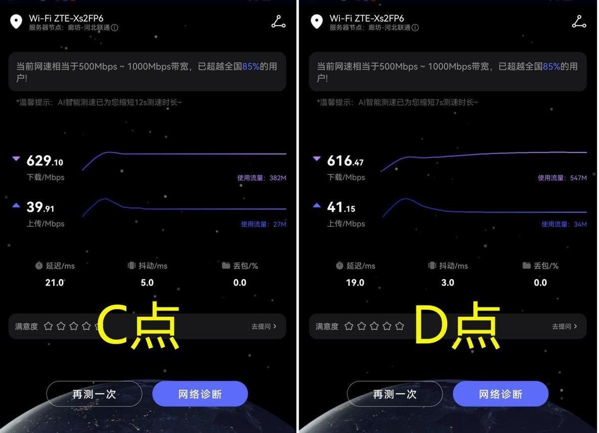 C点位稍微距离远点,直线距离大概6米,中间地形稍微复杂一些,实测下载速度为629.10Mb/s,延迟为21ms。