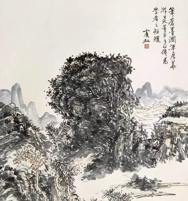 黄宾虹山水中“点”的形象是非常主观化的,所以他山水画中,展现的面貌也极大的区别于前人。他画面中的“点”,或浓重、或淡雅、或直或曲,或燥或润,其点所构成的画面,有的浓黑深邃,混沌无规律可循如黑夜一般;有的画面中施以淡雅之“点”,却也明亮清新、饱含空灵之气,好像山林之中照进了一缕晨光,富有蓬勃的生命力。