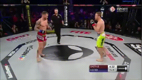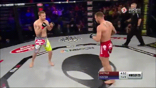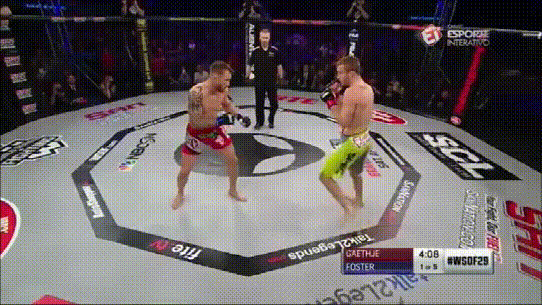 在此处可以看到,当大腿受伤后,对出拳的影响是很大的,Brian Foster左腿受伤至此,连正常的刺拳都打不出来: