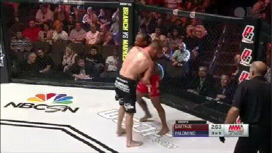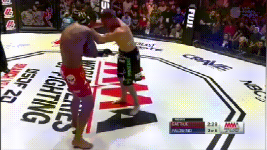 再看这场,平头哥”对上Luis Palomino,最后他也是在低扫后终结对手。不过本场比赛可以看到他会在缠斗时使用低扫!