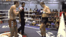 (不少拳手也会在出拳时,迅速前移,并绷紧前腿,或者膝盖略微朝外,硬接对方低扫!虽然都是硬挨低扫踢,但有意识和无意识遭受伤害还是不同的,前腿越接近对手,也越能使对手没有足够空间踢出大力,这是曾经散打运动员打泰拳手的主要方法)