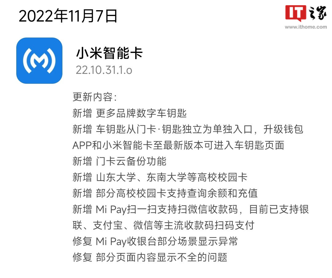 据网友反馈,部分机型的小米智能卡应用迎来了 22.10.31.1.o 更新,本次更新新增更多品牌数字车钥匙,门卡云备份,新增山东大学、东南大学等高校校园卡,新增 Mi Pay 扫一扫支持扫微信收款码,目前已支持银联、支付宝、微信等主流收款码扫码支付。