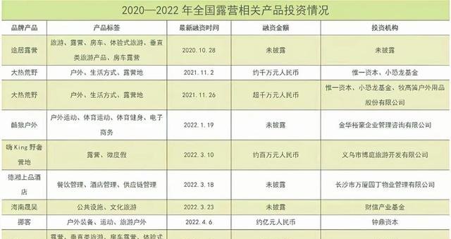 以营地运营为主的户外露营品牌大热荒野成立于2020年,2021年惟一资本对其进行了两轮总计约2000万元的天使轮投资。