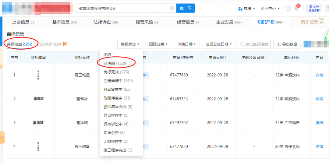 作为一家红遍全国的企业,蜜雪冰城公司已经显示出非常强的商标保护意识,据查询,蜜雪冰城股份有限公司旗下共有2162件商标信息,其中1529件商标已经成功注册。