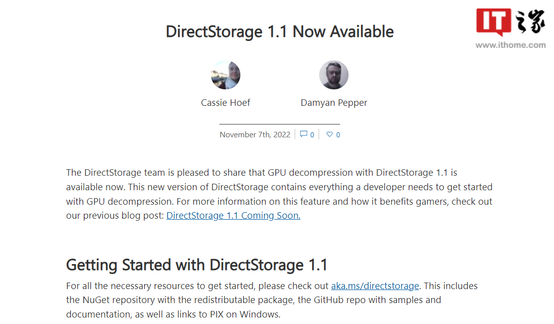 IT之家 11 月 8 日消息,微软上个月在官方博客平台发文宣布,DirectStorage API 即将迎来 1.1 版本更新,带来 GPU 解压游戏资源,加载速度提升 2 倍。