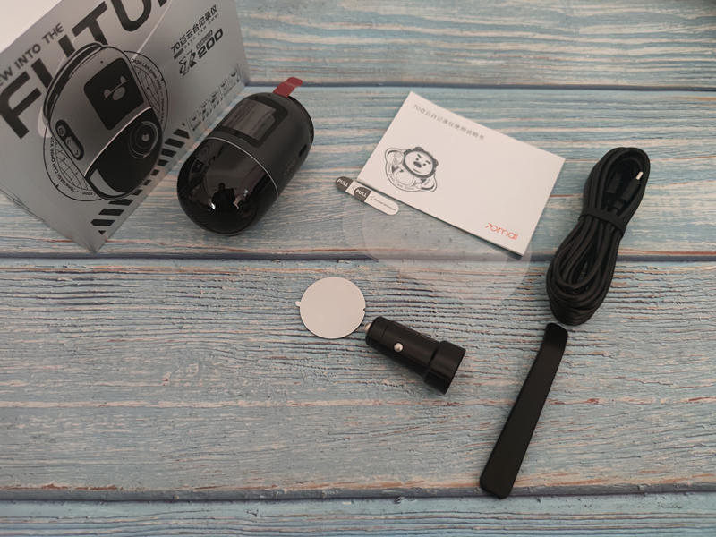 配件包含70迈云台记录仪X200、说明书、静电贴、耐高温胶、车充头、电源线和撬棒。