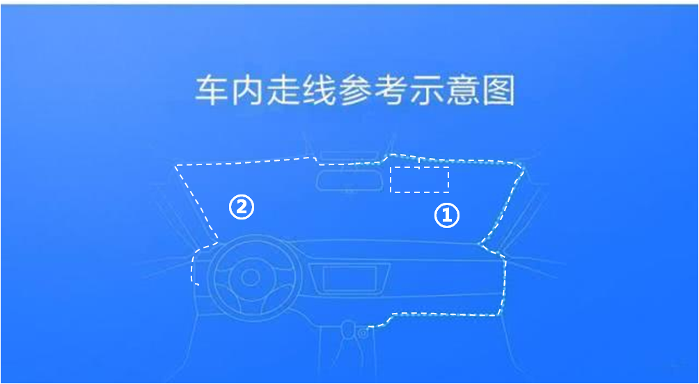 建议安装在汽车副驾驶的前方,就是下图中虚线框的位置,找到合适位置后清洁表面,然后黏贴静电贴,安装后非常牢固,使劲拽都很难拿下来。如果仅安装记录仪按照下图中①进行车内走线,如果搭配4G停车监控线,可以参考下图②进行走线。