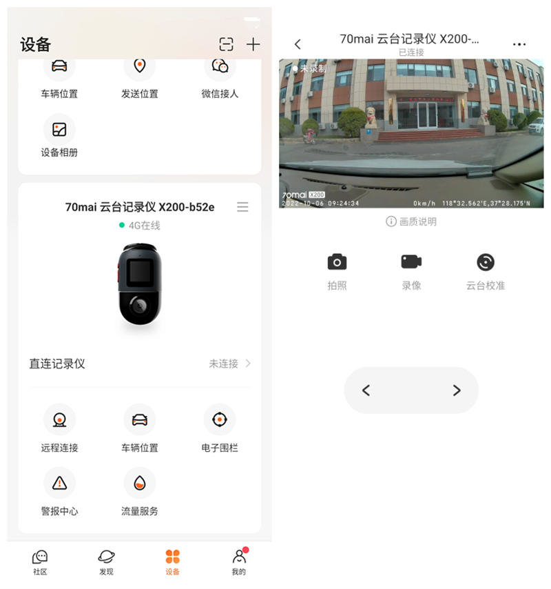 打开70迈APP就可以看到你的设备列表,采用图形化的形式展示简单易懂。点击70迈云台记录仪X200,即可进入设备的管理界面。上面显示实时的录制画面,下面有拍照、录像和云台校准三个功能按钮。