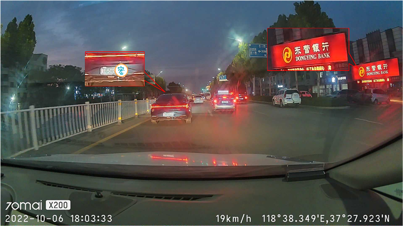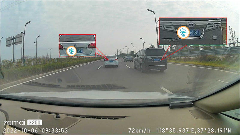 说了这么多,行车记录仪最重要的还是拍的清楚,70迈云台记录仪X200采用全高清1080P分辨率,可以在高速中动态录制高清视频,从下图实拍样张来看,前面双车道的车牌都可以清晰可见,这里为保护隐私抹去车牌几位数字。画面上整体拍摄色彩明亮清晰,140°超广角在画面边缘区域也没有发生畸变,拍摄效果出色。