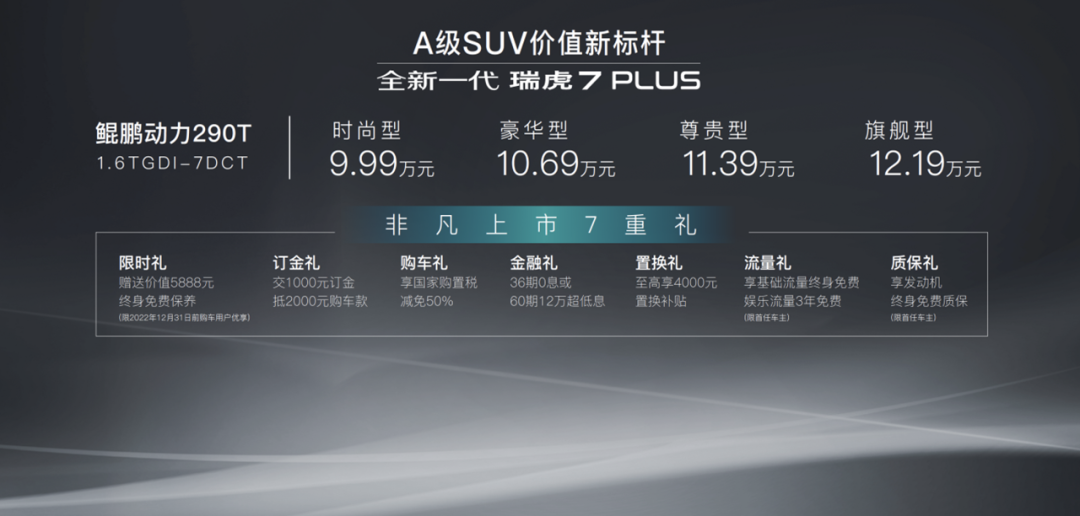 同时,还为用户带来了包括订金礼、购车礼、金融礼、置换礼、流量礼、质保礼等在内的上市7重购车礼遇。此外还特别带来了限时礼:12月31日前购车的用户将享受价值5888元的终身免费保养。全新一代瑞虎7 PLUS以“入门即高配,起步即升舱”的诚意,希望在A级SUV市场中成为“新一代卷王”。