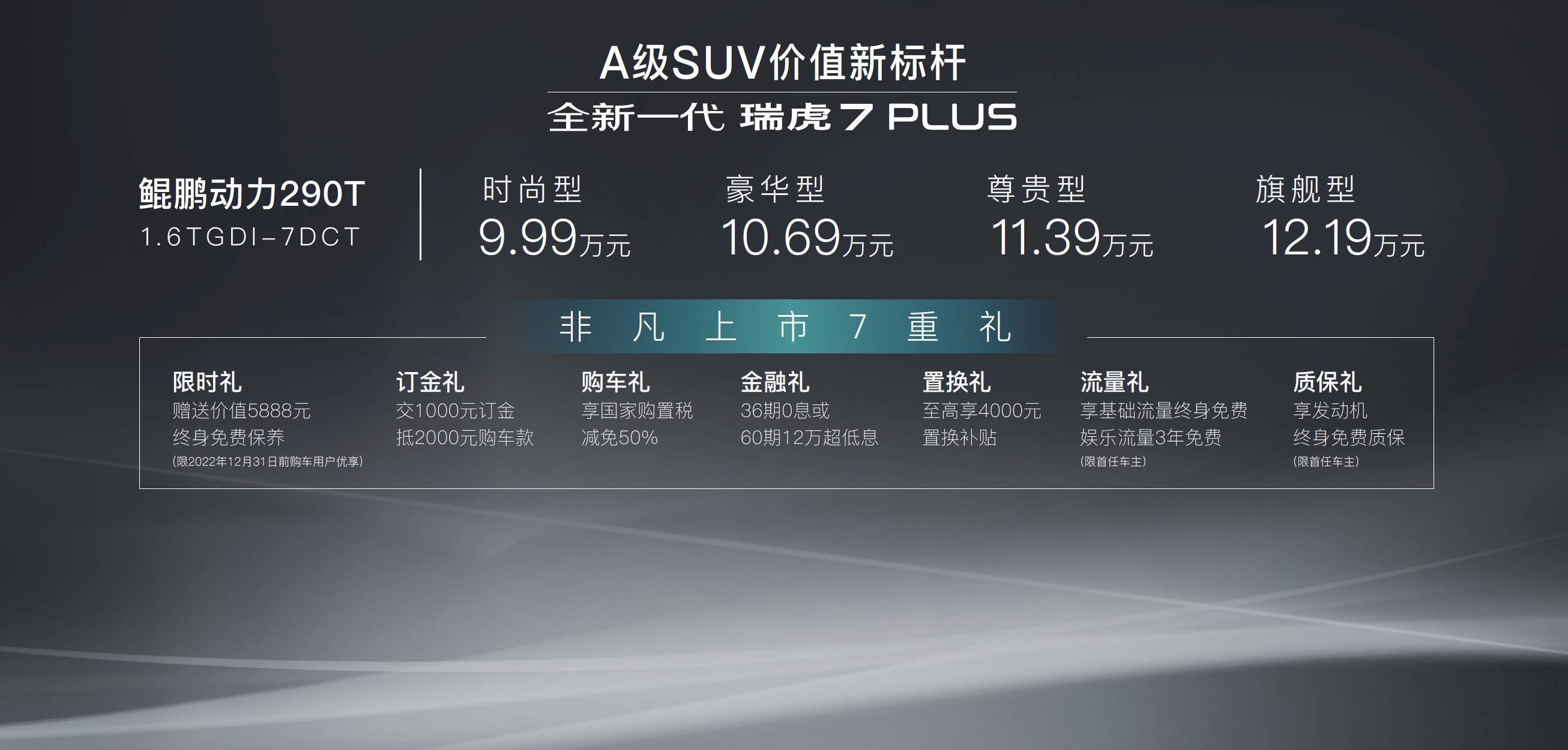此外,在本次上市发布会的现场,奇瑞汽车官方还宣布,将为购买新款瑞虎7 PLUS的顾客提供包括限时礼、订金礼、购车礼、金融礼、置换礼、流量礼、质保礼在内的7重购车礼遇,具体如下。